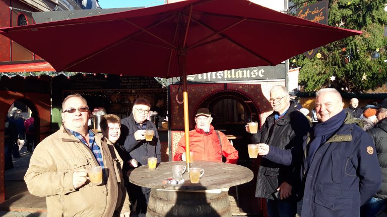Nur einen Steinwurf vom Hotel entfernt, lud der Weihnachtsmarkt zum Bummeln ein. Bei Punsch, Glühwein und Bratwurst, wirkte der Wind schon gar nicht mehr so eisig. Der Marktplatz, romantisch eingerahmt von 80 Holzhütten, geschmückt mit Weihnachtslichtern und Tannen, war neben dem Weihnachtswald der heimliche Treffpunkt der Gruppe. Hier und dort grüßte man sich und prostete sich zu. Im märchenhaften Weihnachtswald auf dem „Schuhhof“, inmitten der historischen Altstadt, unter 60 großen weihnachtlich-romantisch beleuchteten Nadelbäumen, auf duftendem Waldboden, mundete der Glühwein besonders gut.